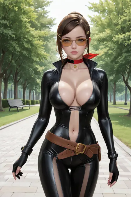 reiko_onechvortex, 1girl, solo, brown hair, hair ornament, hairclip, sunglasses, glasses, scarf, large breasts, cleavage, bodysuit, navel, belt