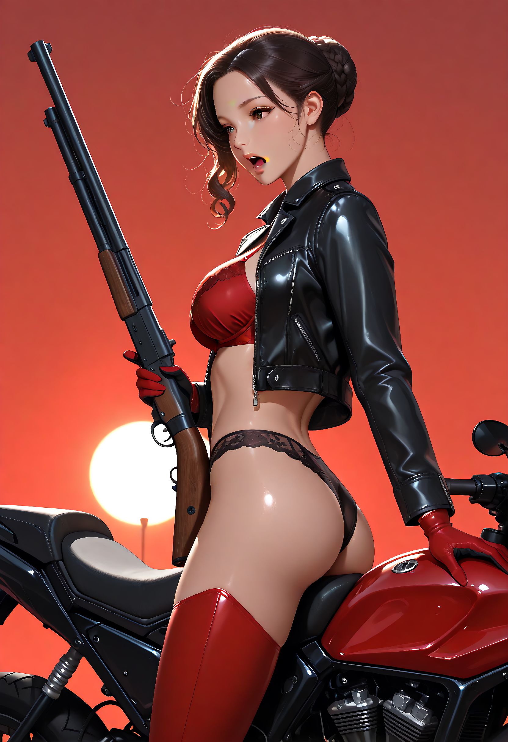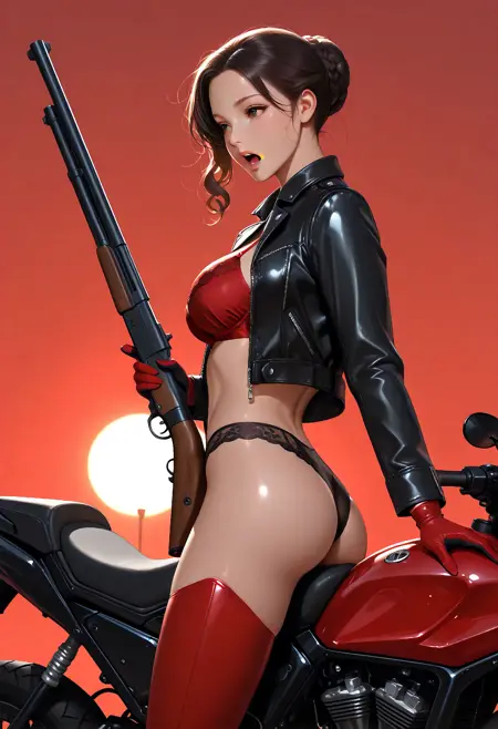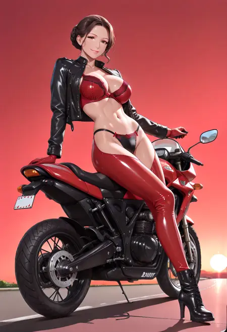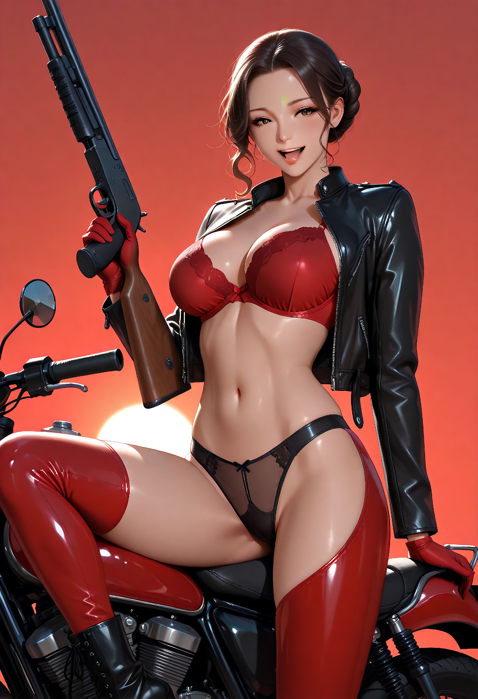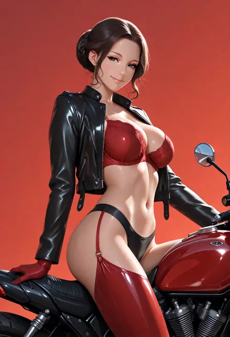 D049, 검은 가죽 자켓, 빨간 브라, 검은 가죽 팬티, 빨간 가죽 커넥티드 카우보이 팬츠, 빨간 가죽 장갑, 검은 가죽 부츠,
