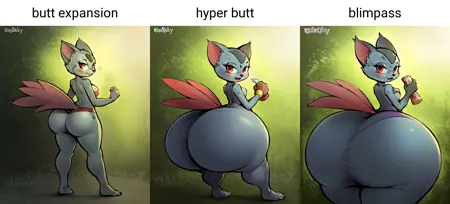 与之前相同,我欣赏的许多画师喜欢绘制极其宽大的髋部,但仅用 “hyper” 来描述宽泛的尺寸范围始终达不到我想要的效果,于是我添加了 blimphips。