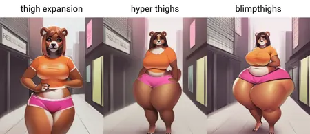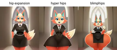 与之前相同,我欣赏的许多画师喜欢绘制极其宽大的髋部,但仅用 “hyper” 来描述宽泛的尺寸范围始终达不到我想要的效果,于是我添加了 blimphips。