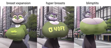 这是我设定尺寸大小的一种方式,按从小到大排列,“hyper” 之前不足以描述非常大的尺寸。你也可以加上 “heliumtits” 来获得一种轻盈、漂浮的可爱效果,而非沉重感。