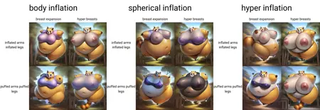 With this latest update (the 4.0 models above), I have spend the past couple weeks -completely- reworking the dataset and tags. Right now it's a total of 1873 images being trained. I am trying to make every inflation concept that I like all in one model, so far I'm pretty happy with the results. I will try to list every tag with some explanation below so keep reading~