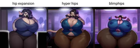 与之前相同,我欣赏的许多画师喜欢绘制极其宽大的髋部,但仅用 “hyper” 来描述宽泛的尺寸范围始终达不到我想要的效果,于是我添加了 blimphips。