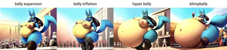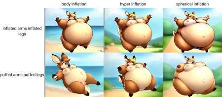 Body inflation - 球形になる直前の、膨らんだが完全な球形ではない外観。単なるお腹の膨らみではなく、まだ球形ではない状態です。inflated arms と inflated legs と組み合わせると効果的です(まだくぼんでいないため、puffyではありませんXD)。