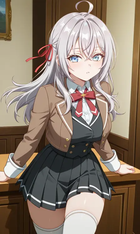알리사 미하일로브나 쿠조, 긴 머리, 앞머리, 아호게, 눈 사이의 머리카락, 교차된 앞머리, 양쪽 위로 올린 머리, 파란 눈, 머리 리본, 아호게, 회색 머리, 빨간 리본, 큰 가슴, 허벅지, 애니메이션 컬러링,