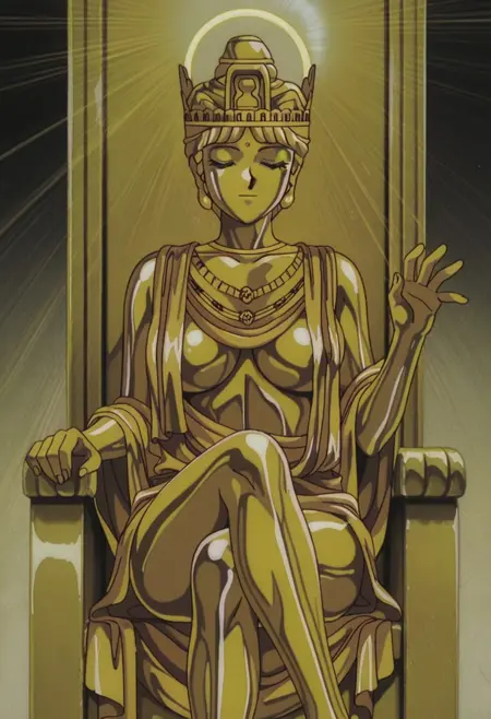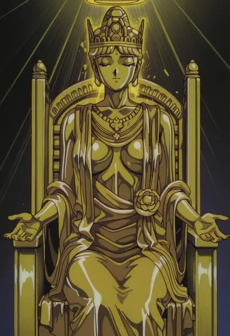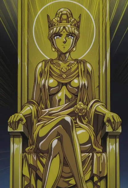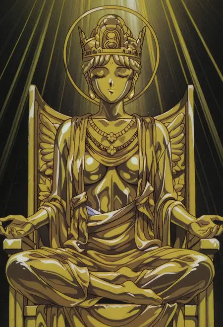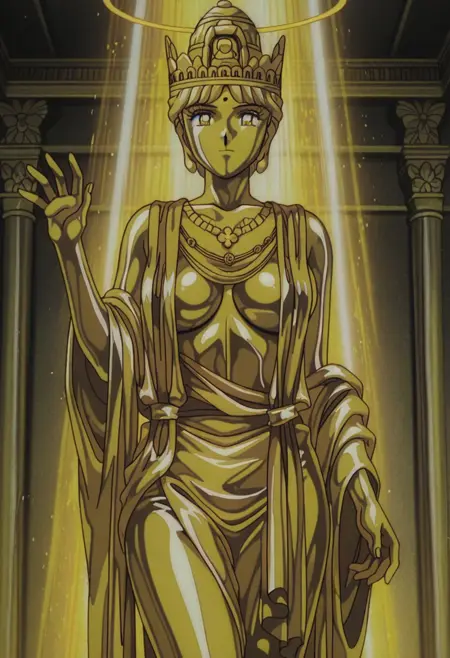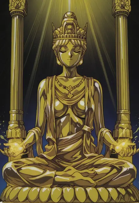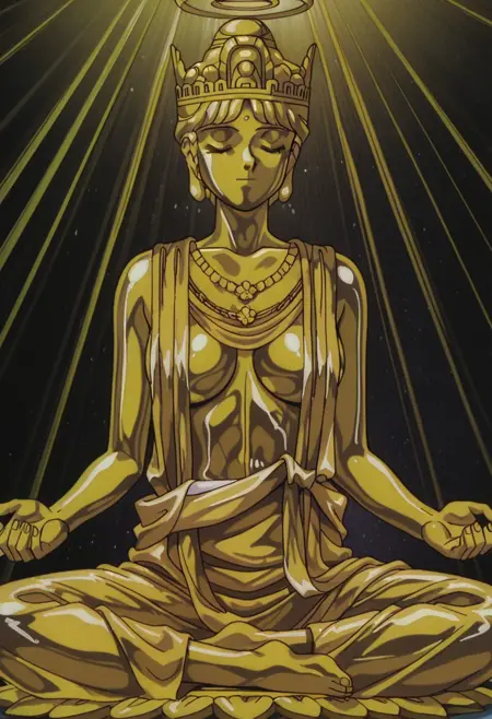 GoldenBuddahHoney, 1girl, solo, retro artstyle, 1990s \(style\), golden hair, hair bun, short hair, golden eyes, white sclera, eyelashes, forehead mark, large breasts, colored skin, yellow skin, golden skin, golden crown, golden jewelry, glowing, golden robe, underboob, halo, golden necklace, barefoot, golden statue,