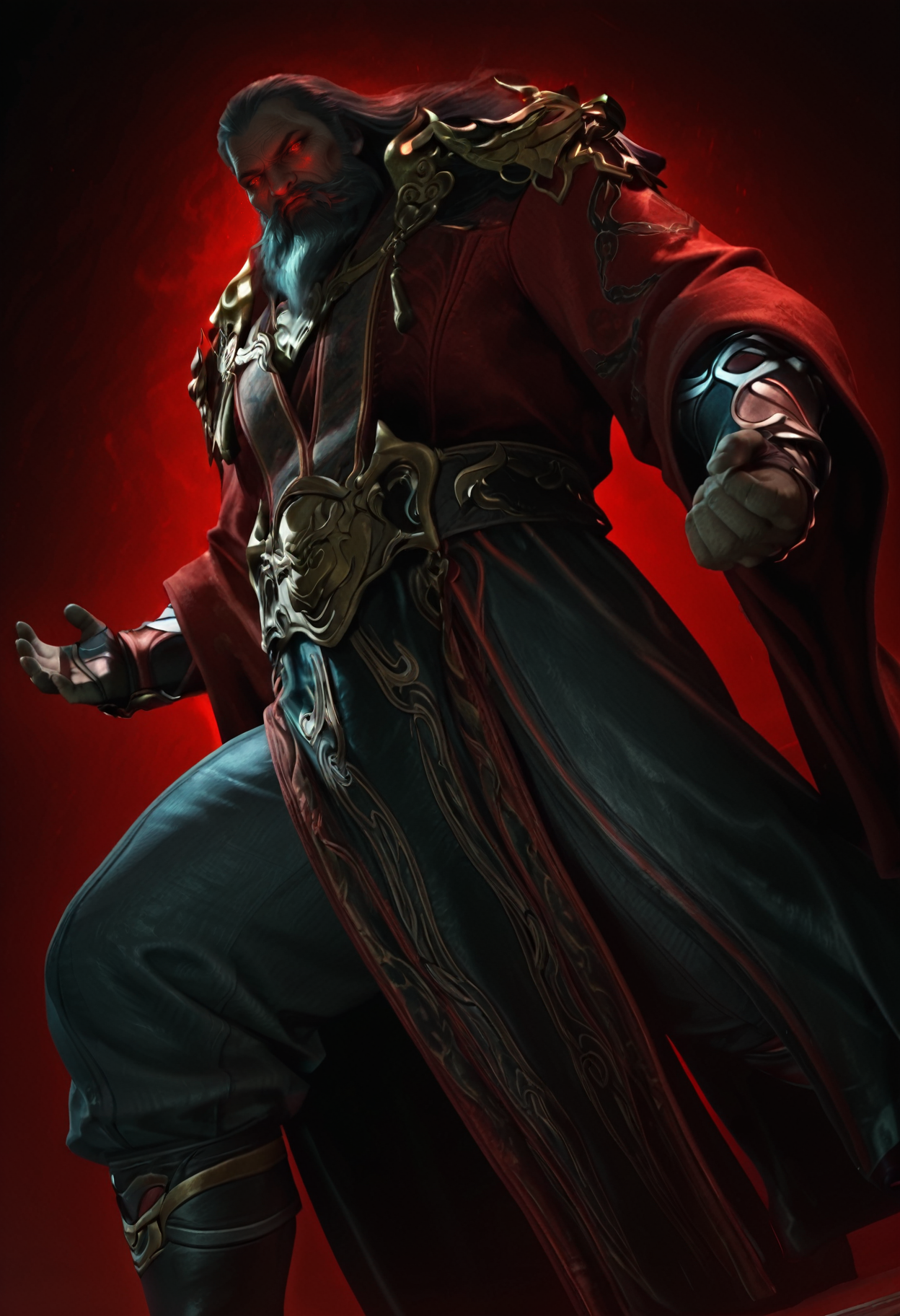 gold_embellished_collar,chinese clothes,robe,layered clothes,front cloth,long sleeves,wide sleeves,gauntlets,belt,hem,dark gray pants,boots,