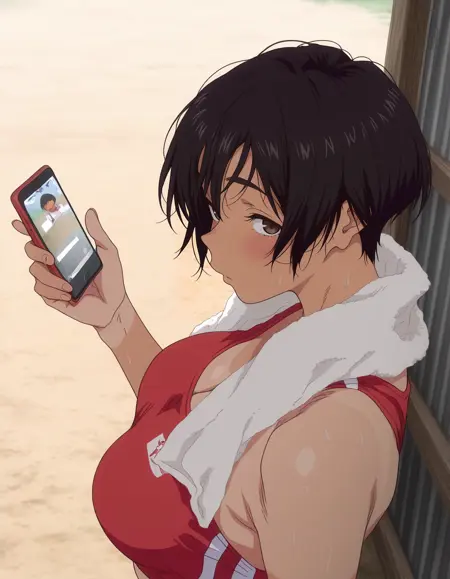 mai_xnc,mai_xng1,mature_female,short_hair,brown_hair,brown_eyes,one-piece_tan,towel_around_neck,red_sports_bra,red_buruma,barefoot