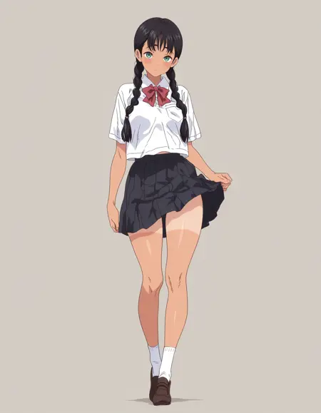 mai_xnc,mai_xng3,long_hair,green_eyes,twin_braids,black_hair,tanlines,school_uniform,shirt,skirt,bow
