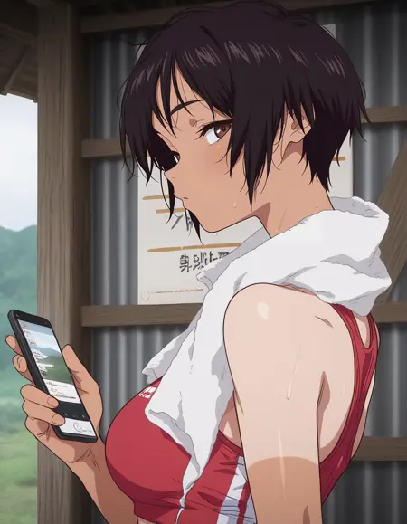 mai_xng1,short_hair,brown_hair,brown_eyes,one-piece_tan,towel_around_neck,open_jacket,track_jacket,red_sports_bra,red_buruma,barefoot