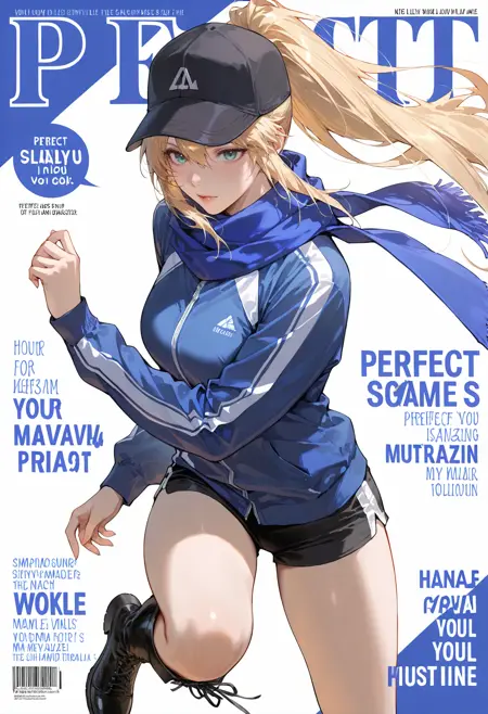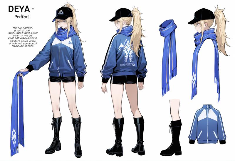 scarf,blue scarf,hat,hair through headwear,boots,shorts,jacket,baseball cap,cross-laced footwear,black footwear,lace-up boots,black headwear,knee boots,black shorts,track jacket,blue jacket,short shorts,long sleeves