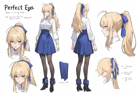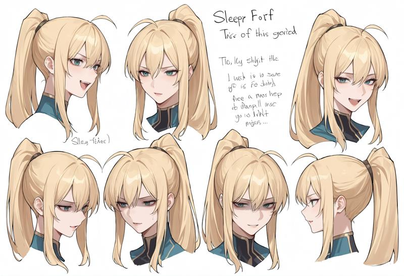 1girl,green eyes,blonde hair,ahoge,long hair,blue eyes,hair between eyes,ponytail,bangs,sidelocks