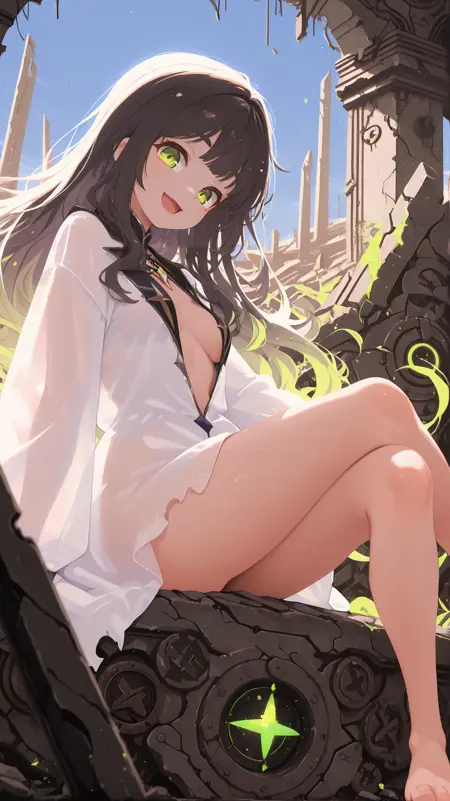 示例提示:长发,刘海,棕色头发,肚脐,绿眼睛,多色头发,小乳房,