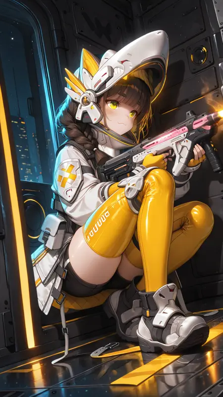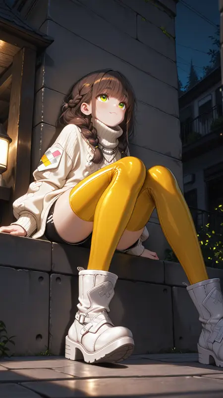 long sleeves, jacket, white jacket, white boots, white footwear white backpack, helmet, yellow gloves, fingerless gloves, shorts, short shorts, black shorts, yellow thighhighs,
