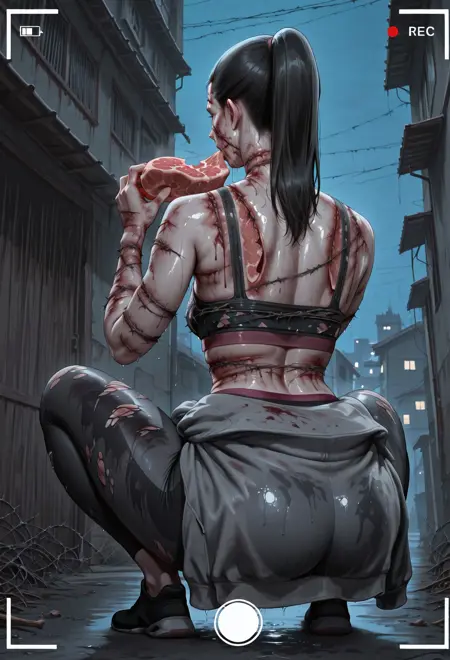 1girl, zombie, 黑发, 马尾, 灰色眼睛, 嘴唇, 锁骨, 小乳房, 肚脐, 腹部, 疤痕, 伤口, 苍白皮肤