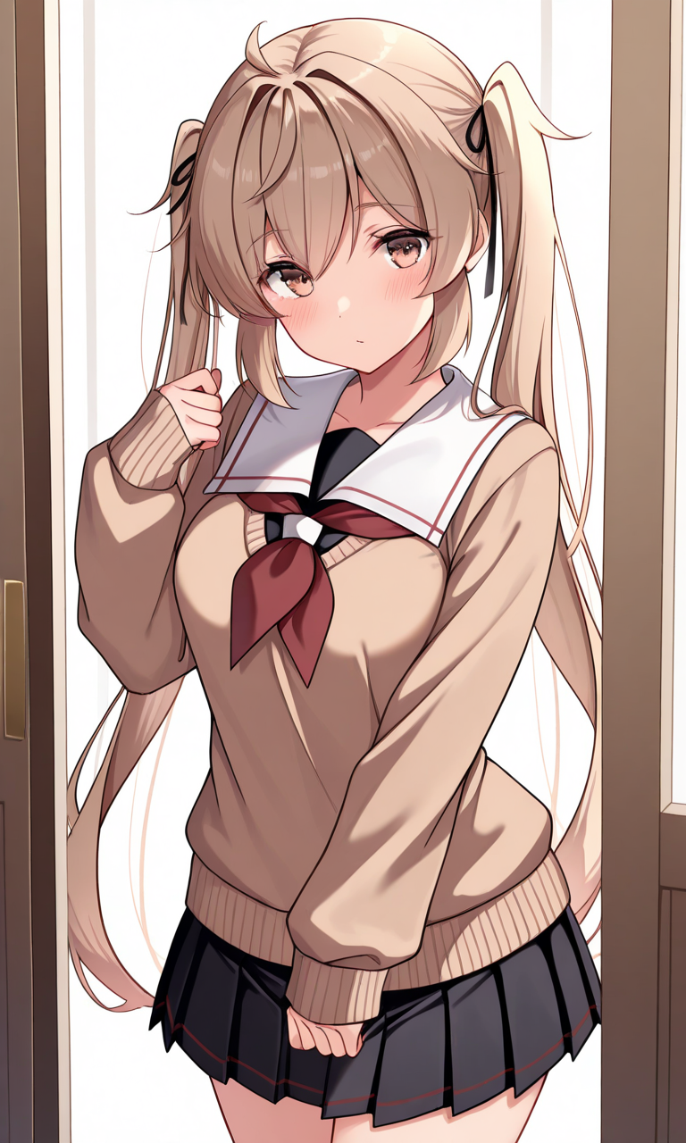 Sanma 복장: murasameKC, 긴 머리카락, 치마, 긴 소매, 트윈테일, 학교 유니폼, 아호게, 머리 리본, 주름 치마, 검은 치마, 검은 리본, 빨간 넥커치프, 흰 해군형 칼라, 검은 사레푸쿠, 갈색 스웨터, murasame_(kancolle)