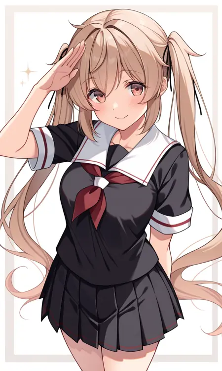 Kai 복장: murasameKC, 연한 갈색 머리카락, 갈색 눈, 긴 머리카락, 트윈테일, 머리 리본, 짧은 소매, 주름 치마, 검은 치마, 검은 셔츠, 검은 리본, 빨간 넥커치프, 흰 해군형 칼라, 검은 사레푸쿠, murasame_(kancolle)