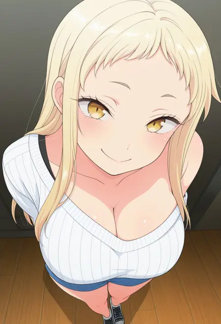 Aika takamura apperance : 1girl, long hair, breasts,1boy , blonde hair, medium breasts, brown eyes, , yellow eyes, short bangs , sidelocks