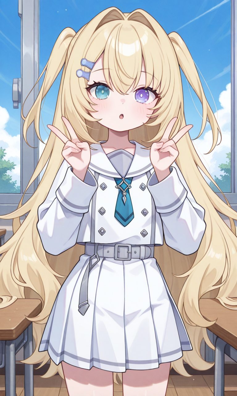 memento vanitas, memento un1form, heterochromia, very long hair, two side up, hairclip, white sailor collar, white shirt, double-breasted, long sleeves, blue necktie, grey belt, white skirt, pleated skirt- 신발: