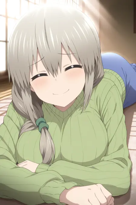 uzaki tsuki、灰色の髪、目を閉じた、眉間に髪、肩にかかる髪
