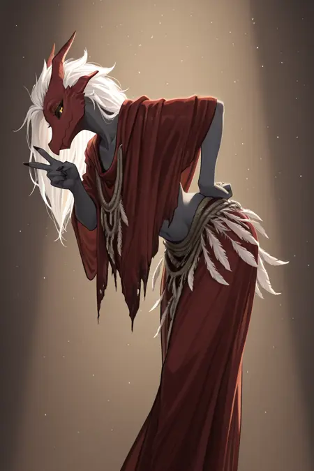 female, florissax, dragon, anthro, grey skin, red head, yellow eyes, black sclera, long skirt, loose robe,