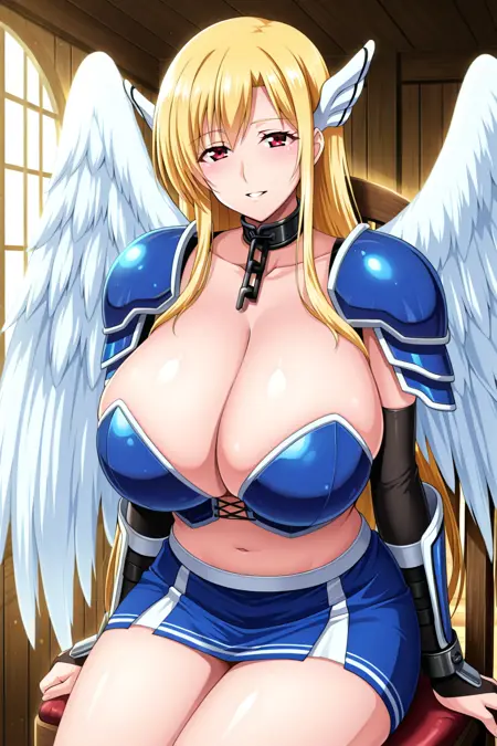 Red eyes, blonde hair,bangs,Long hair,angel wings on her head, head wings, bridal gauntlets,