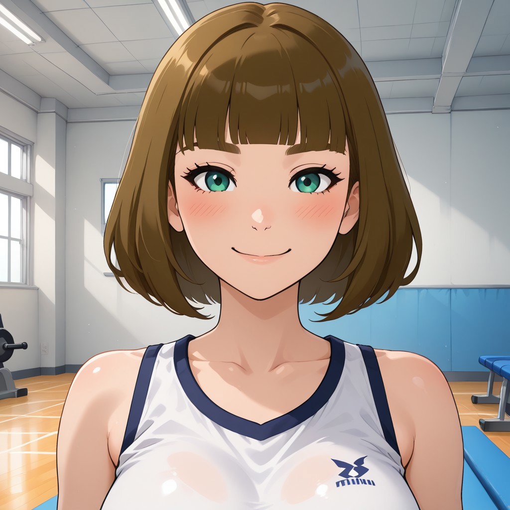 MillieWSC, 1girl, brown hair, blunt bangs, green eyes, blush