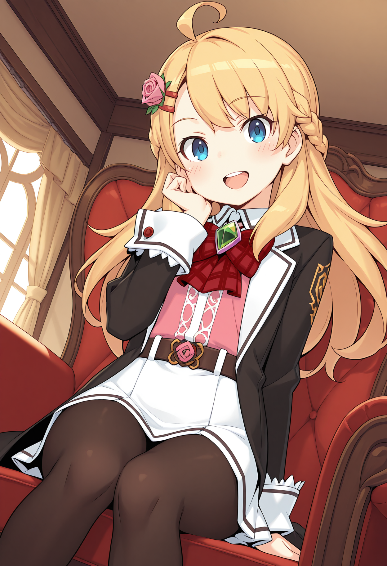 髪の花, ヘアクリップ, ピンクの薔薇, 黒いコート, 開いたコート, 白いカラー, ライナー付きシャツ, 赤いボウタイ, チェック柄ボウタイ, 宝石, ピンクのシャツ, ベルト, 赤い薔薇, 白いスカート, 黒いパンティーストッキング,
