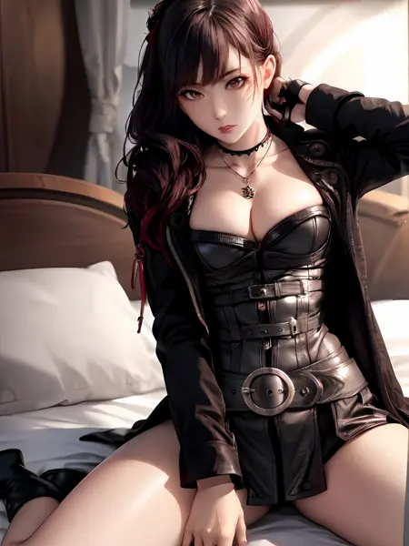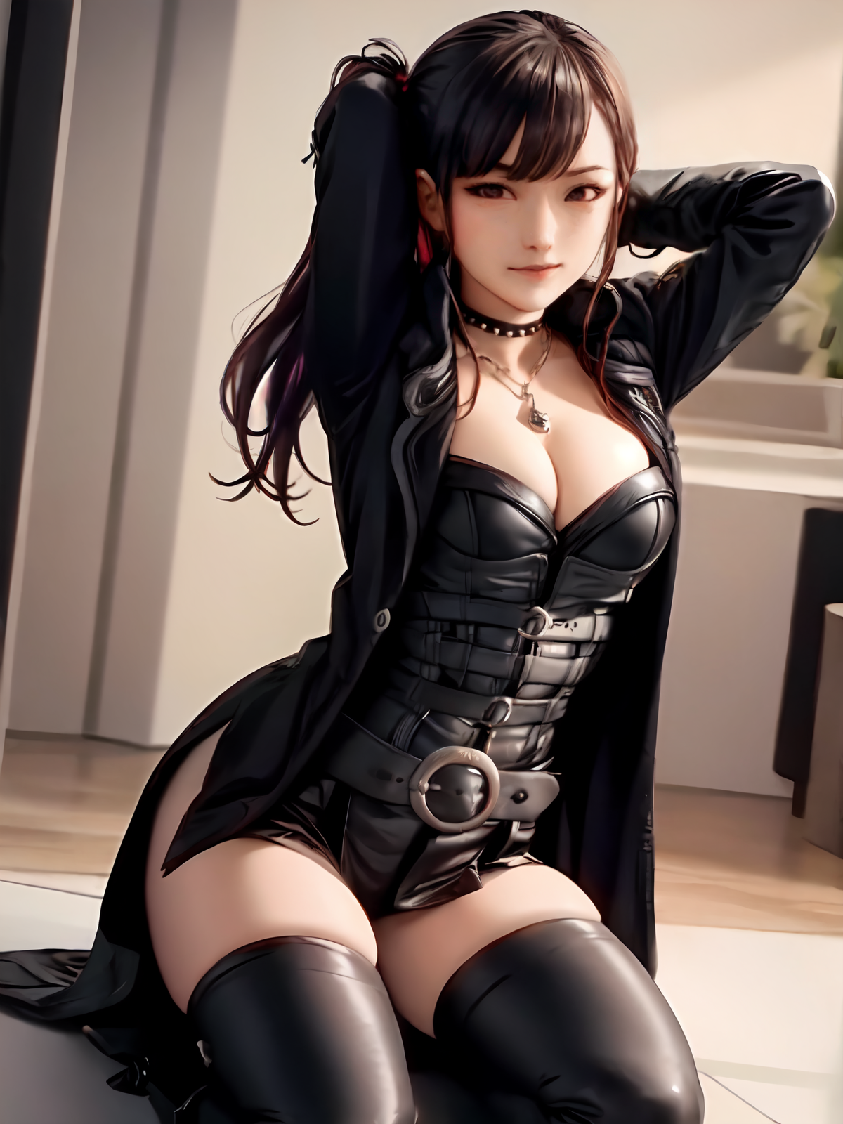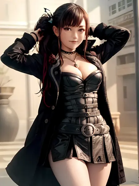 提示词:belt, boots, jacket,jewelry, necklace, choker, breast, cleavage,long hair, black hair, corset, mole, fingerless gloves, black jacket, pantyhose, multicolored hair, bangs,gloves,hair hornament,leather jacket,coat