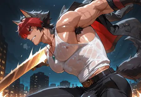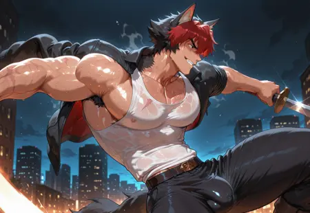 Komano, red hair, black hair, multicolored hair, animal ears, scars, wolf tail, brown eyes, white tank top, side pec, black pants,
