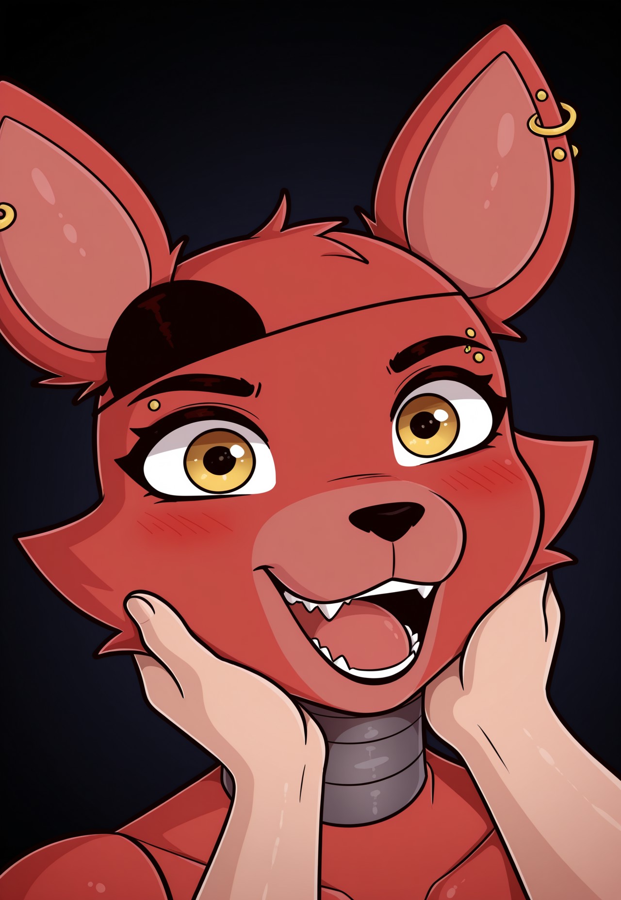 タグ:solo, 1girl, foxy_kev, アニマトロニック, キツネ, ファリー, アンスロ, 女性, 赤い毛, 二色毛, 黄色い目, 動物の耳, 尾, 黒い鼻, 目パッチ, 開いた目パッチ, 胸の毛束, 金属製の手, 金属製の足,