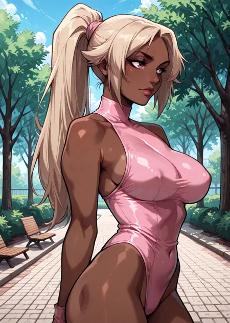 Rhea_s0a,深色皮肤女性,紫色眼睛,金色头发,马尾辫,粉色紧身衣