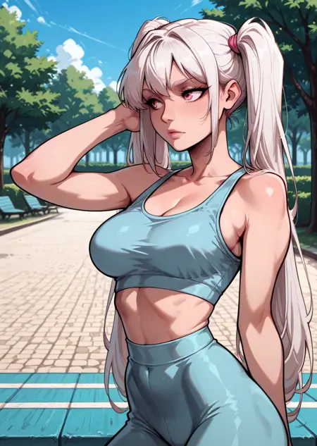 alice_s0a,粉红色眼睛,白色头发,双马尾,alice_yoga,蓝色衣服,运动文胸,瑜伽裤,