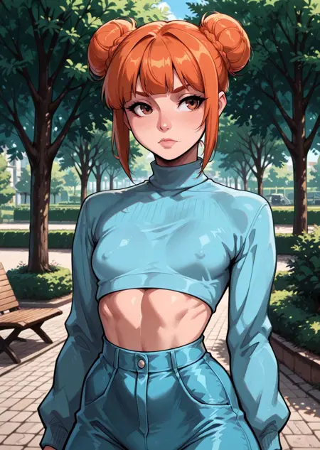 Andrea_s0a,棕色眼睛,橙色头发,双发髻,齐刘海,短发,侧发,纤细腰身,宽臀,小胸,腹肌
