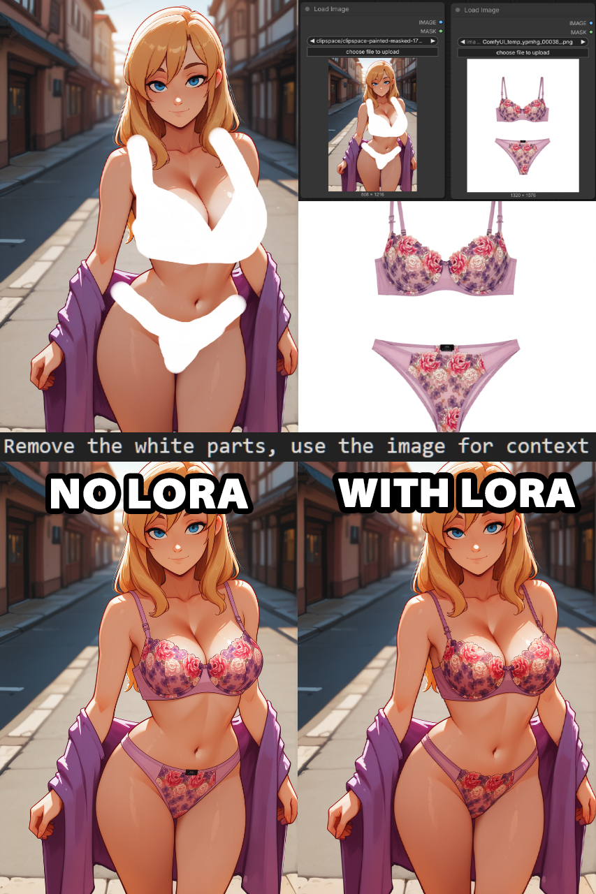 두 이미지 간의 품질이나 배경이 너무 다르다면 머리색, 위치 등의 추가 컨텍스트를 입력해야 할 수 있지만, 제 경험상 가능한 한 간단히 하는 것이 좋습니다. 더 일관된 품질을 원한다면, 이 업스케일 LoRa를 사용해 성공적인 결과를 얻었습니다. 다른 색상을 시도해볼 수 있지만, 저는 흰색 외에는 테스트하거나 학습하지 않았습니다.