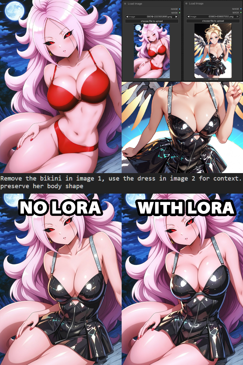 먼저, 이 개념은 Qwen Image Edit가 이미 어느 정도 수행할 수 있습니다. 흰 부분 제거라는 프롬프트를 사용하면 아웃페인팅이 매우 잘 됩니다. 컨텍스트 이미지를 추가할 수도 있지만, 효과가 우수하지 않거나 최적의 결과를 내지 못합니다. 무엇에 도움이 될 수 있는지에 대한 아이디어는 예시를 참고하세요. 이 모델은 사진만으로 학습되었지만, 애니메이션에도 잘 작동하는 것 같습니다. Runpod을 사용하여 학습되었으며, Ostris 튜토리얼의 도움을 받았습니다.