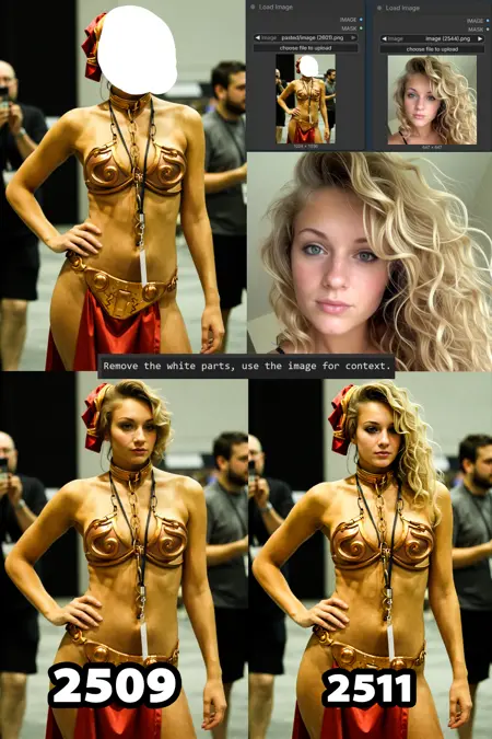 用于内补(Inpainting): 你可以使用 Photoshop 或 ComfyUI 内置遮罩编辑器中的白色画笔,参见下方示例: