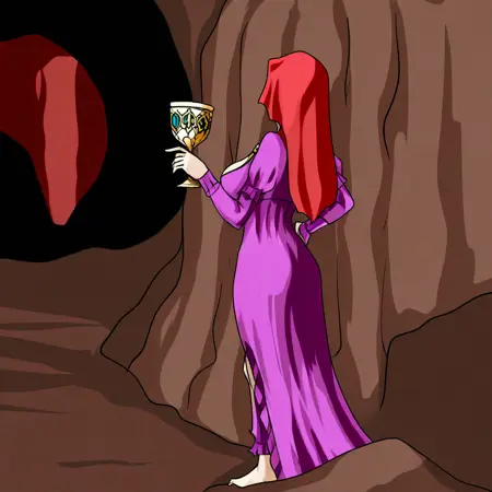 red cloth, red hood, red vail, purple gloves, red pedicure, purple pants, short pants, puffy short sleeves, holding cup,