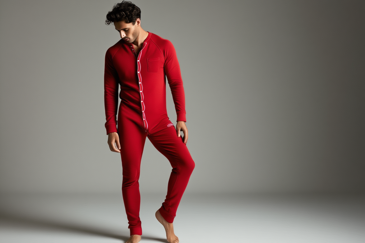 This model generates images of men wearing union suit-style long underwear, also known as "onesies" or "long johns".