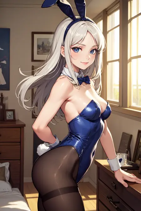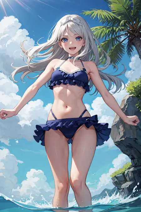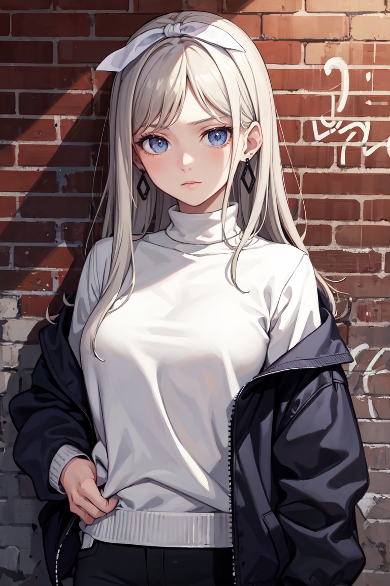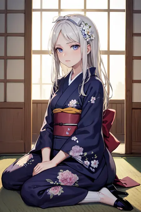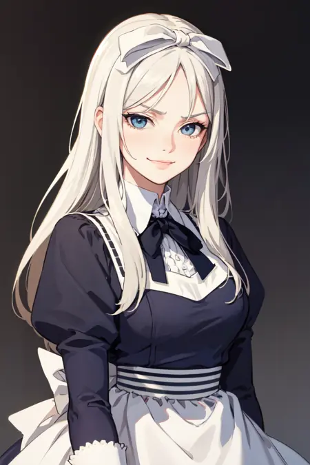 彼女の標準的な外見には "long hair, parted bangs, white hair ribbon" を追加してください。