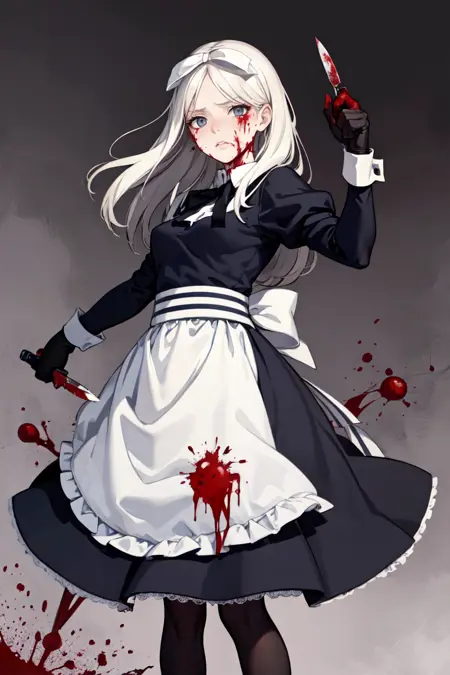 "dress, black gloves, bow, striped, apron, petticoat, black pantyhose"