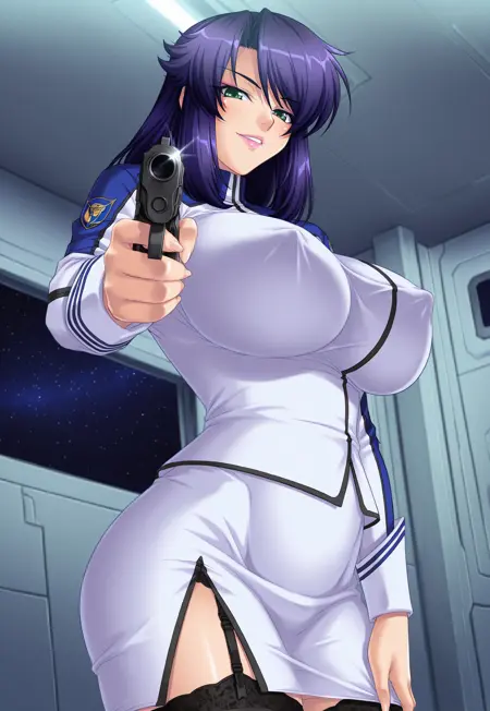 第一套服装:星际联邦军制服,军装,长袖,袖口,侧开衩,迷你裙,铅笔裙,黑色过膝袜,白色靴子