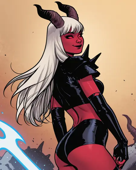 触发词:1girl, solo, magikdarkcaor, demon girl, colored skin, red skin, horns, white hair, colored sclera, red eyes, crop top, cleavage cutout, shoulder armor, spikes, shorts, short shorts, thighhighs, midriff, elbow gloves