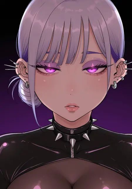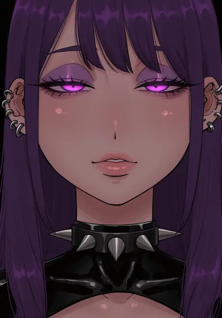 saitou-san, 1girl, 자주색 머리카락, 긴 머리카락, 검은 눈, 연한 빨간 아이섀도우, 통통한 입술, 윤기 나는 입술, 긴 손톱, 아크릴 네일, 보라색 네일, 눈 아래 점, 여러 개의 귀 꽃핀, 큰 가슴