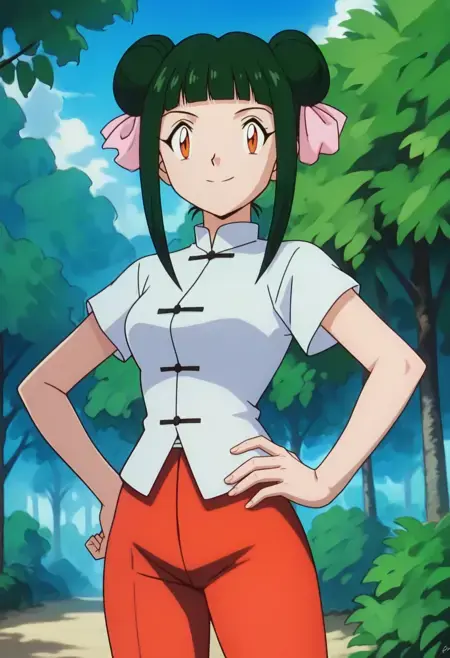 PMCassandra、オレンジ色の目、緑色の髪、ストレートな前髪、二つ結び、サイドロール、髪留め、ピンクのリボン