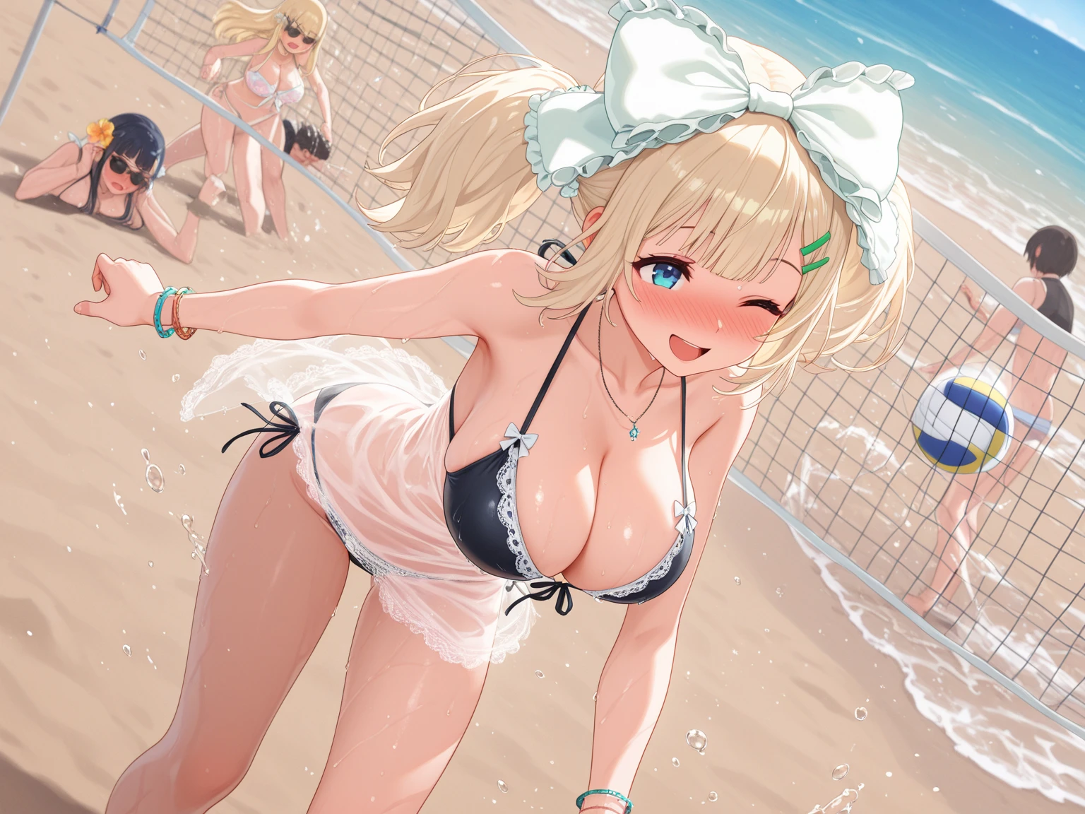 Yomi、青い目、金髪、ヘアクリップ、ヘアオーナメント、白いリボン、髪のリボン、ストレートの前髪、ツインテール、青い目、巨乳、胸元、ジュエリー、下着、黒い水着、ビキニ、サイドタイのビキニ下着、ネックレス、ブレスレット、透け感、チェック柄、ランジェリー、サングラス