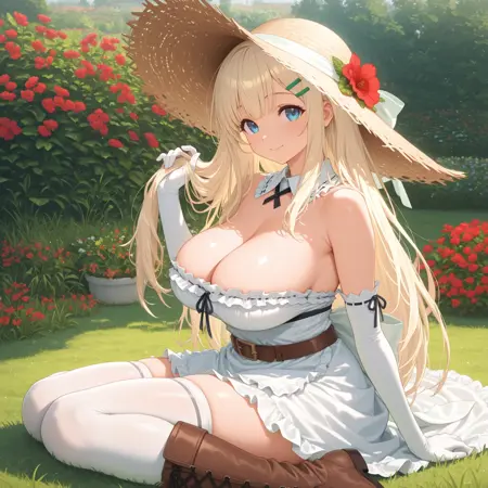 Yomi、長髪、青い目、金髪、巨乳、ヘアオーナメント、白い手袋、帽子、ベレー帽、緑の頭飾り、白いドレス、肩出し、フリル、胸元、白いタイツ、ブーツ、ヘアクリップ、ベルト、白い手袋、肘までグローブ、外した襟、エプロン、茶色の靴、靴ひも式ブーツ、ブーツ、膝丈ブーツ