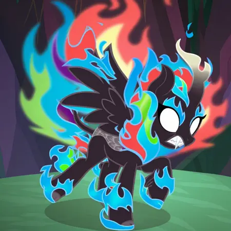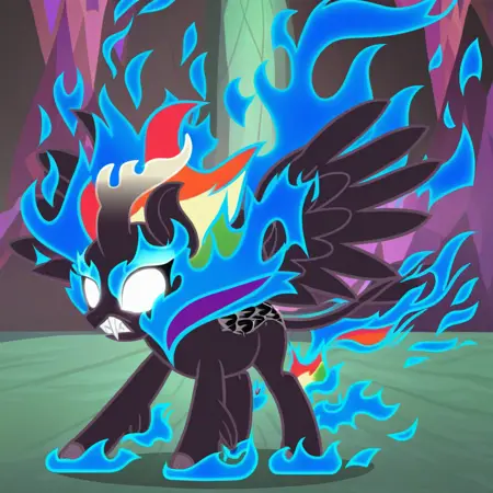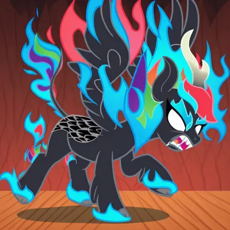 <lora:MLP - Nirik Transformation:1>, nirik, kirin transformation, dark kirin, fiery mane and tail, glowing white eyes, flaming hooves,