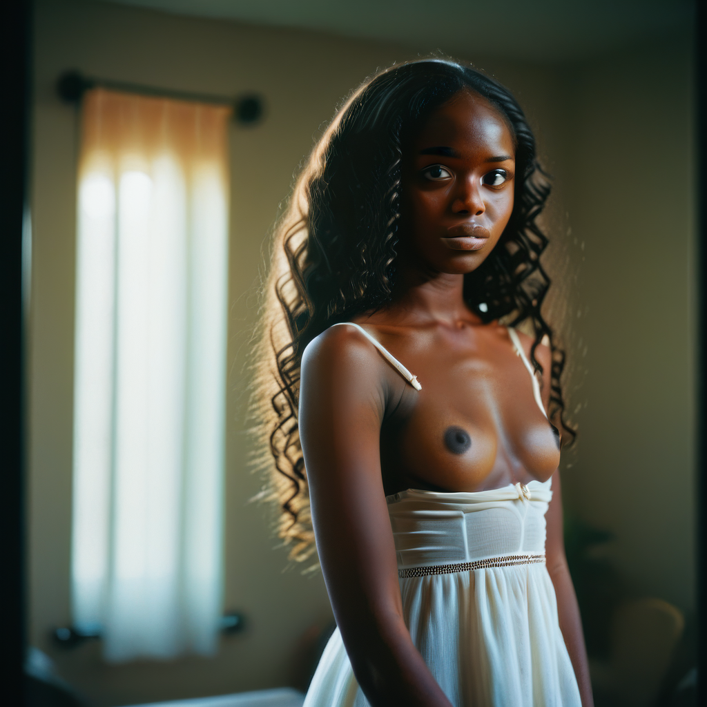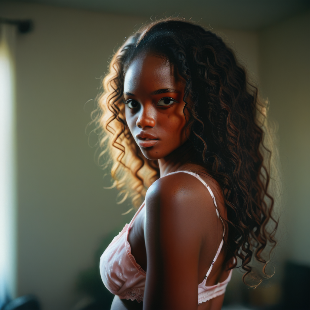 She has warm, radiant dark skin that carries a natural glow, the kind that makes every photo feel soft, welcoming, and beautifully lit without any effort. Her smile is bright and expressive, full of gentle warmth that instantly transforms a simple moment into something charming and memorable. It’s the kind of smile that adds life to an image and makes her presence feel uplifting and genuine. Her curly hair falls around her face in soft, defined spirals, catching the light in a lovely way that adds depth, texture, and a sense of effortless style.