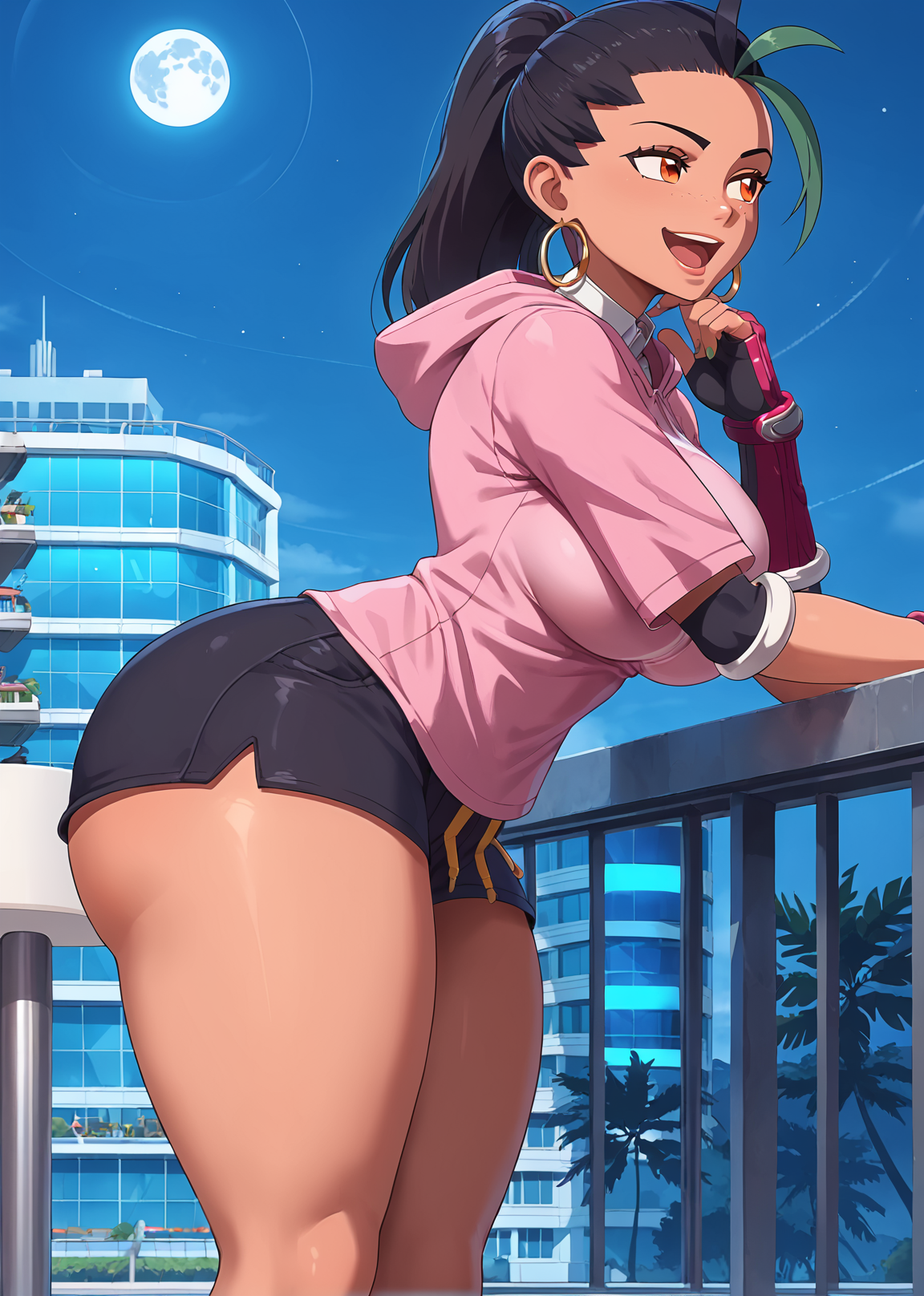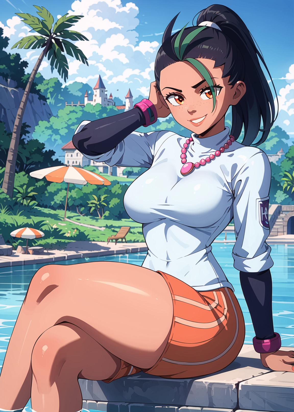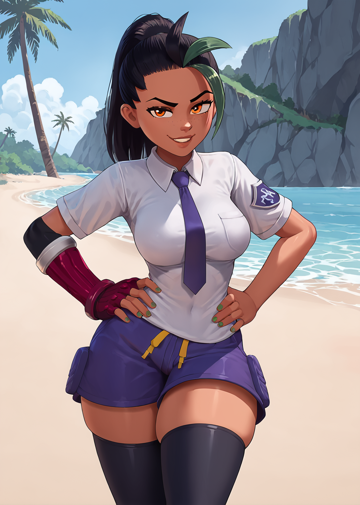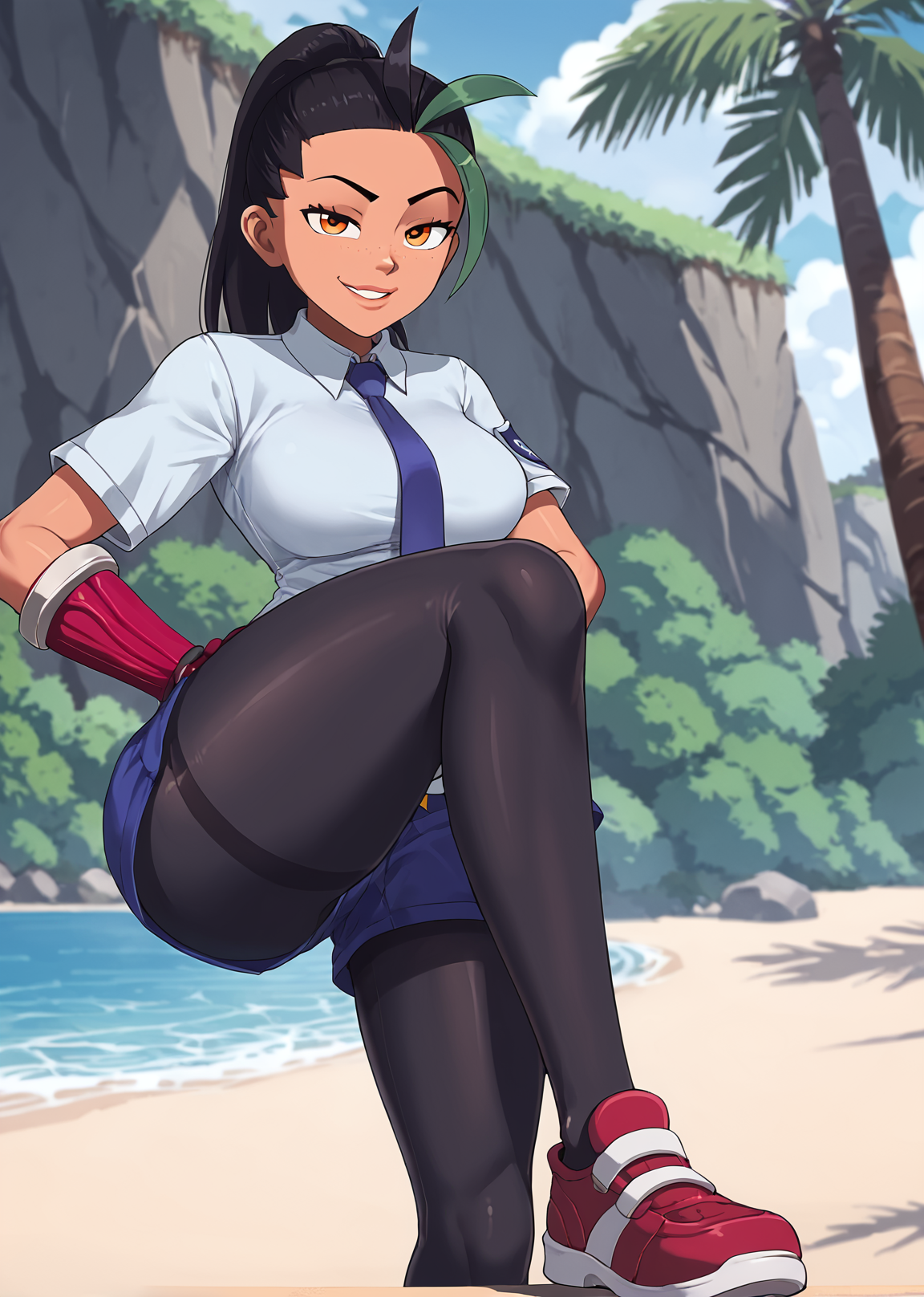 trigger words: 1girl, solo, dark skin, freckles, black hair, multicolored hair, green streaks, forehead, ponytail, orange hair, necktie, collared shirt, baggy shorts, shorts, black pantyhose, pinkish red footwear